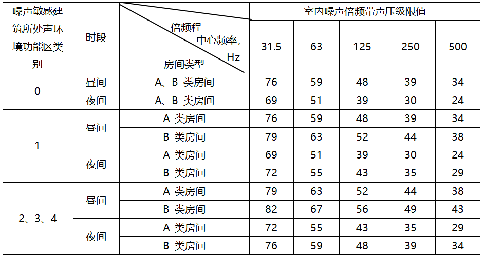 當固定設備排放的噪聲通過建筑物結構傳播至噪聲敏感建筑物室內時,噪聲敏感建筑物室內等效聲級不得超過表 2 和表 3 規定的限值。